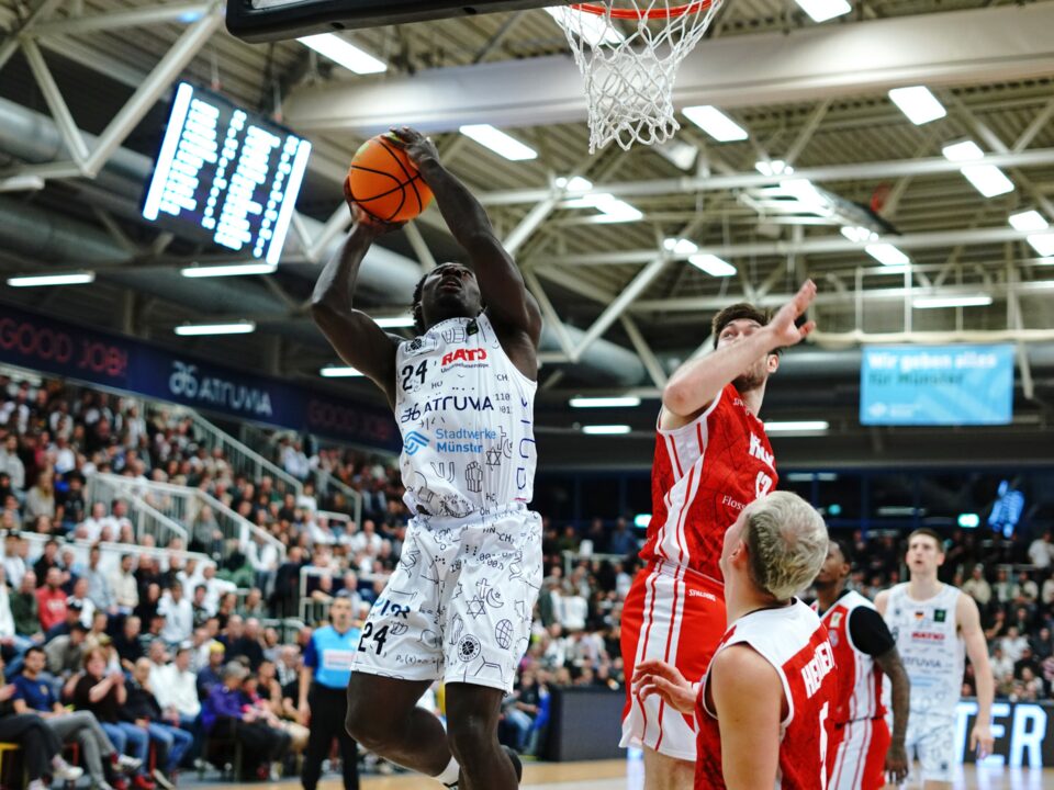 13. April 2023(ts) Was für eine Dramatik, was für eine Steigerung in der zweiten Halbzeit: Das vorletzte Heimspiel der WWU Baskets gegen das Spitzenteam Artland Dragons vor 2.550 begeisterten Fans ließ keinen kalt. Die Gäste hatten nach ausgeglichenem Auftakt bis zur Pause die Oberhand, die WWU Baskets Münster waren die bessere Mannschaft in den zweiten 20 Minuten. Das Team von Björn Harmsen drehte einen 12-Punkte-Rückstand nach 25 Minuten: Am Ende hieß es 83:77 (36:43). Mit dem achten Heimsieg ging der Aufsteiger in die BARMER 2. Basketball Bundesliga ProA einen Riesenschritt Richtung Klassenerhalt, dem nur noch ein theoretischer Dreiervergleich im Weg steht.