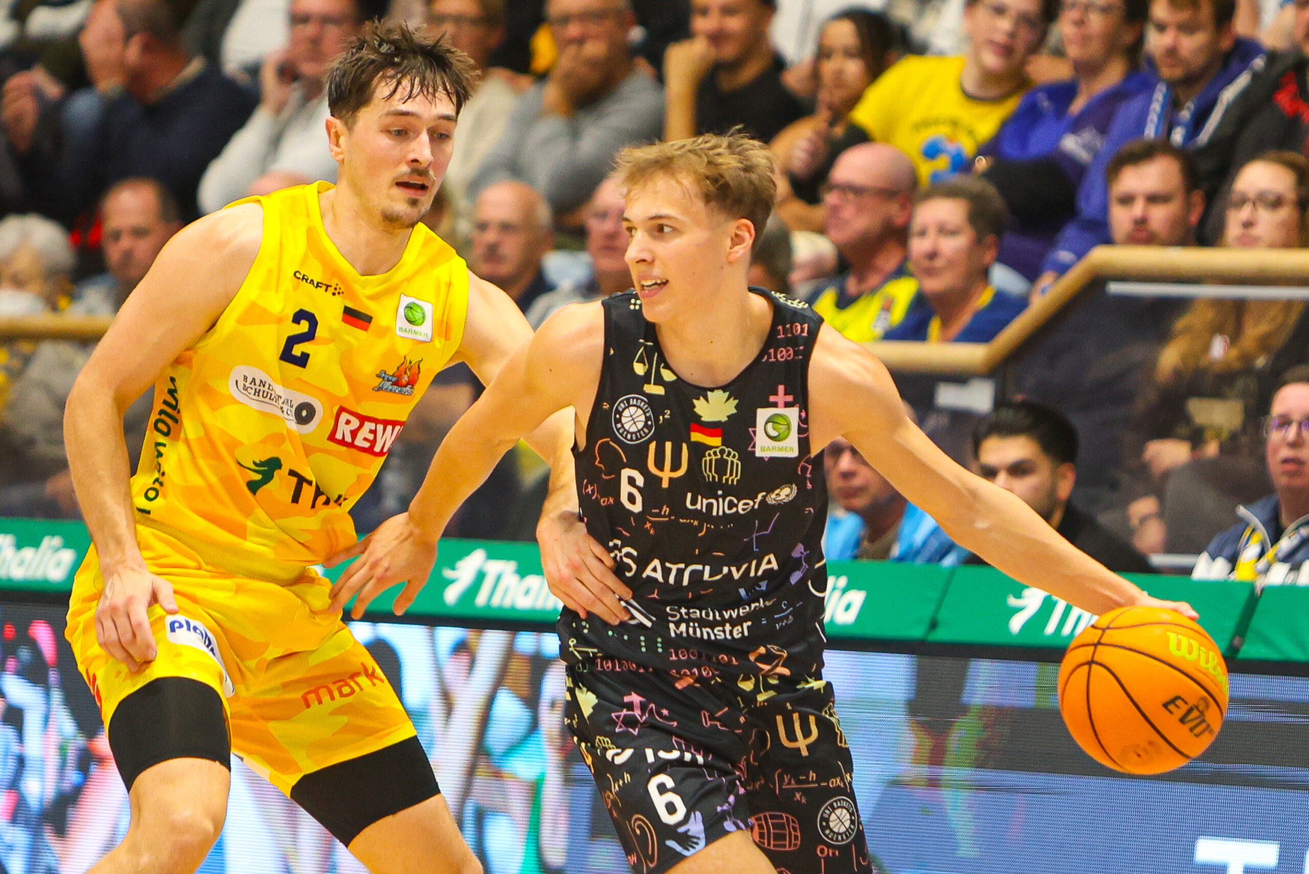 Sportlich trafen stark dezimierte Münsteraner ohne ihre drei Leistungsträger Adam Touray, Cosmo Grühn und Julius Ferber – Jason Ani ging stark gehandicapt in die Partie – auf den gastgebenden Aufstiegsanwärter in Bestbesetzung. Die Uni Baskets gerieten früh unter Druck nach dem 2:12-Start nach wenig mehr als zwei Minuten, konterten indes zum 12:14 nach einem Dreipunktspiel von Nick McMullen bis Mitte des Auftaktviertels. Es war ab jetzt ein offener Schlagabtausch – mit der verpassten Chance zum Führungswechsel durch Julian Larrys Distanzwurf (16:14, 7.), aber Bo Hodges holte immerhin per Korbleger den Ausgleich nach (16:16, 9.). Die passende Münsteraner Defensive hatte das Fundament im Viertelverlauf gelegt. 19:16 führte der Gastgeber nach Abschnitt eins.