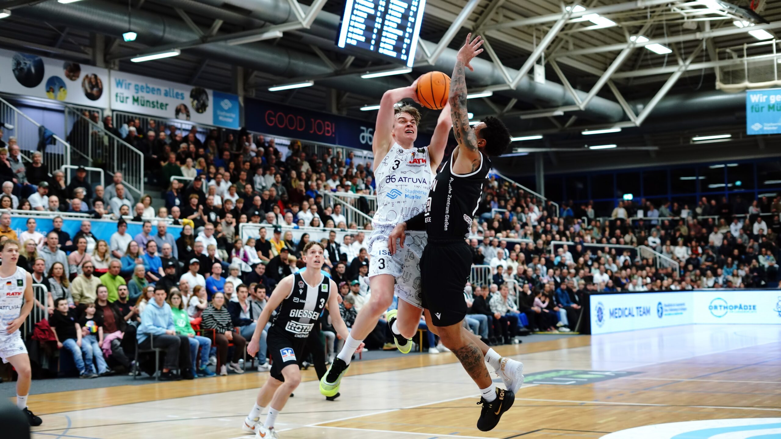 4. Dezember 2025(ts) Im letzten Heimspiel blieb den Uni Baskets Münster gegen das Top-Team Gießen der Lohn für eine leidenschaftliche und mitreißend geführte Partie noch verwehrt. Mit diesem Spirit und ihren Fans im Rücken geht die Münsteraner Mannschaft Samstag die nächste Herausforderung in der BARMER 2. Basketball Bundesliga ProA an: punktgleiche Paderborn Baskets mit den beiden Topscorern der Liga. Das Westfalen-Duell in der Halle Berg Fidel mit dem großen „Wessi“-Abschied ist noch nicht ausverkauft, Tickets gibt’s wie gewohnt im Online-Ticketshop bis zum Hochball um 19.30 Uhr – kostenlose für die Studierenden über das Kultursemesterticket.