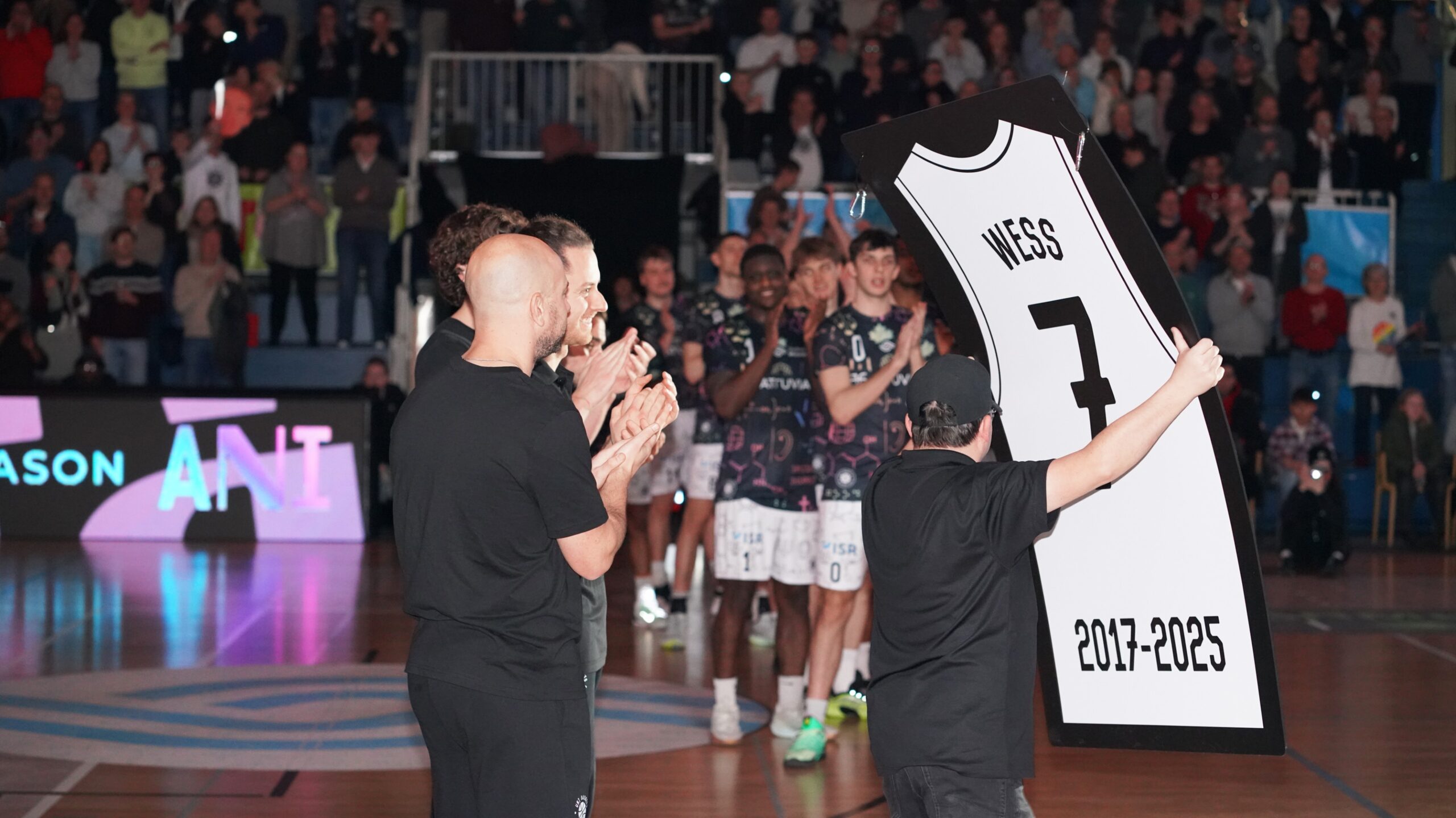 Während der Zeremonie nach dem Spiel meldeten sich zahlreiche Wegbegleiter über die Hallenleinwand zu Wort und würdigten den 31-Jährigen. Als das Trikot unter das Hallendach gezogen wurde, gab es lang anhaltende „Wessi, Wessi“-Sprechchöre und donnernden Applaus von den Fans der Uni Baskets – viele mit glänzenden Augen und manch einer Träne. „Ich möchte an meinem Platz immer für die Uni-Baskets-Leute sprechen, für die vielen, vielen Fans, die immer hier sind. Du bist einfach für uns unser ‚Wessi‘!“, sprach Hallensprecher Heri Koch ihnen aus der Seele, bevor ihm die Stimme wegbrach.
