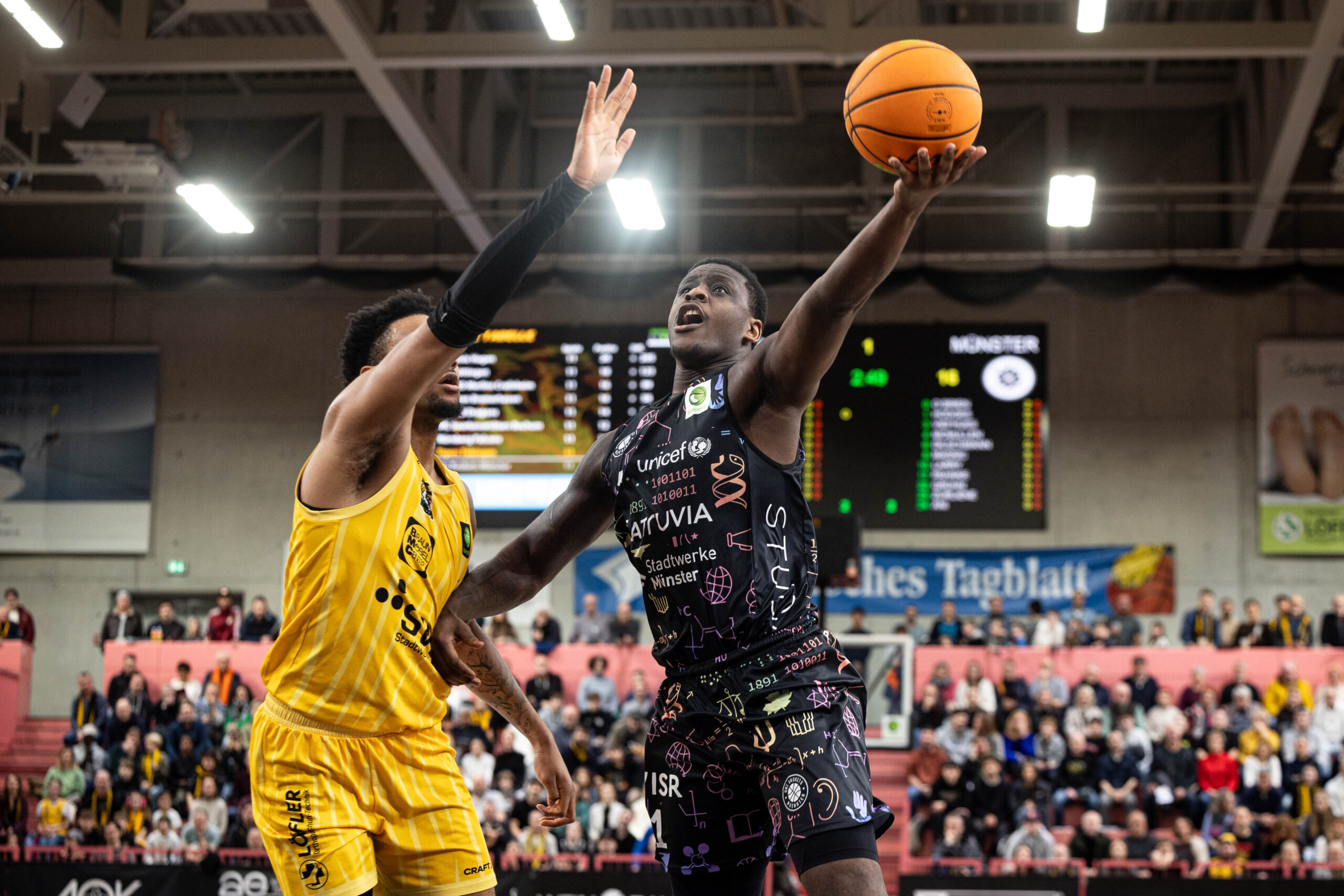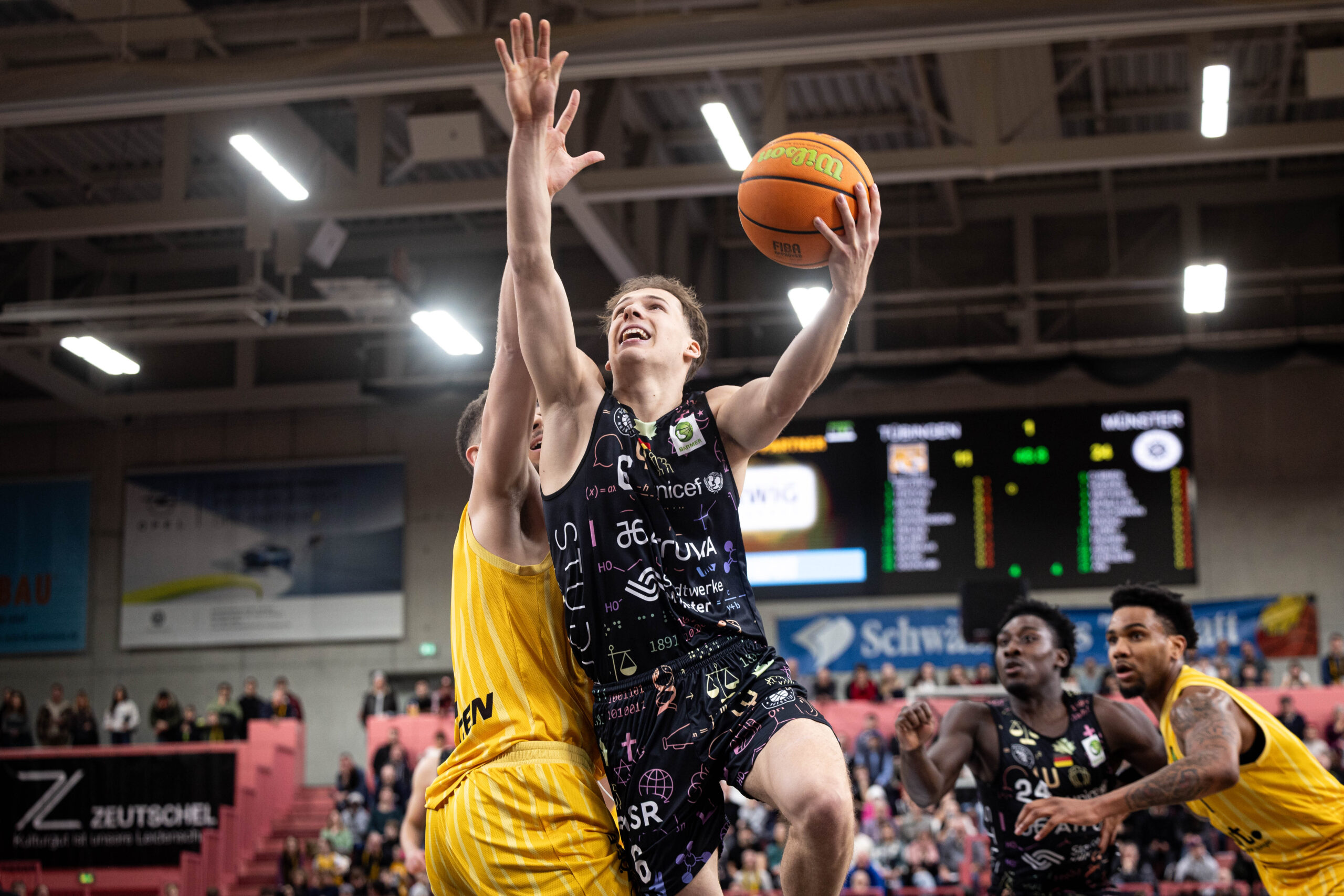 13. Dezember 2025(ts) Die Uni Baskets feiern Befreiungsschlag in Tübingen: Eine fulminante erste Halbzeit der Münsteraner war am Samstagabend der Grundstein des eminent wichtigen 83:71-(43:27)-Auswärtserfolgs. Vor 1.972 Fans beeindruckte das Team von Götz Rohdewald im Schlussviertel auch mit der Souveränität, mit der es die Tübinger Aufholjagd trotz zuvor sieben Niederlagen in Serie nach einer 18-Punkte-Führung bis auf fünf Zähler noch vor der Crunchtime konterte. Letztlich fuhren die Uni-Städter ihren zweiten Auswärtserfolg hochverdient und ungefährdet ein.