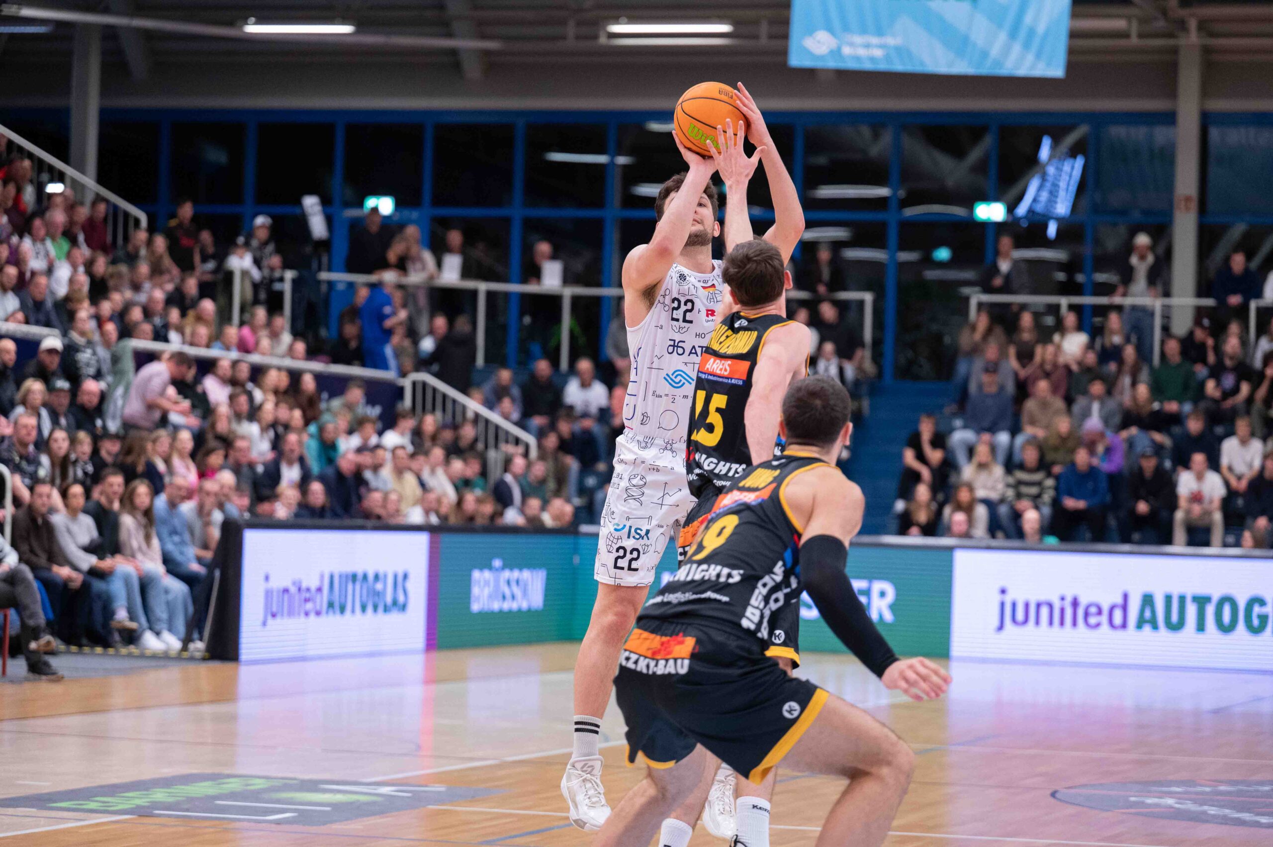 18. Dezember 2025(ts) Der „Mannschaft der Stunde“ lange getrotzt und alles entgegengesetzt: Die Uni Baskets Münster konnten den Ausbau der Erfolgsserie der Knights Kirchheim auf nunmehr 7:1-Siege am Donnerstagabend nicht stoppen. Vor immerhin 2.150 Fans an einem Wochentag unterlagen die Uni Baskets 79:93 (40:45). Nach einer starken Phase führte der Gastgeber neun Sekunden vor der Pause 40:39 und schwächte sich mit dem zweiten unsportlichen Foul ihres Point Guards Larry selbst. Ohne dann vier Leistungsträger gaben nicht eingespielte Rotationen kämpferisch alles – Assists (21:21), Rebounds (34:34), Ballverluste (13:11) und Dreierquote (42:45 Prozent) waren (fast) ausgeglichen – doch die Teckstädter spielten ihre Qualität zum letztlich ungefährdeten Erfolg aus.