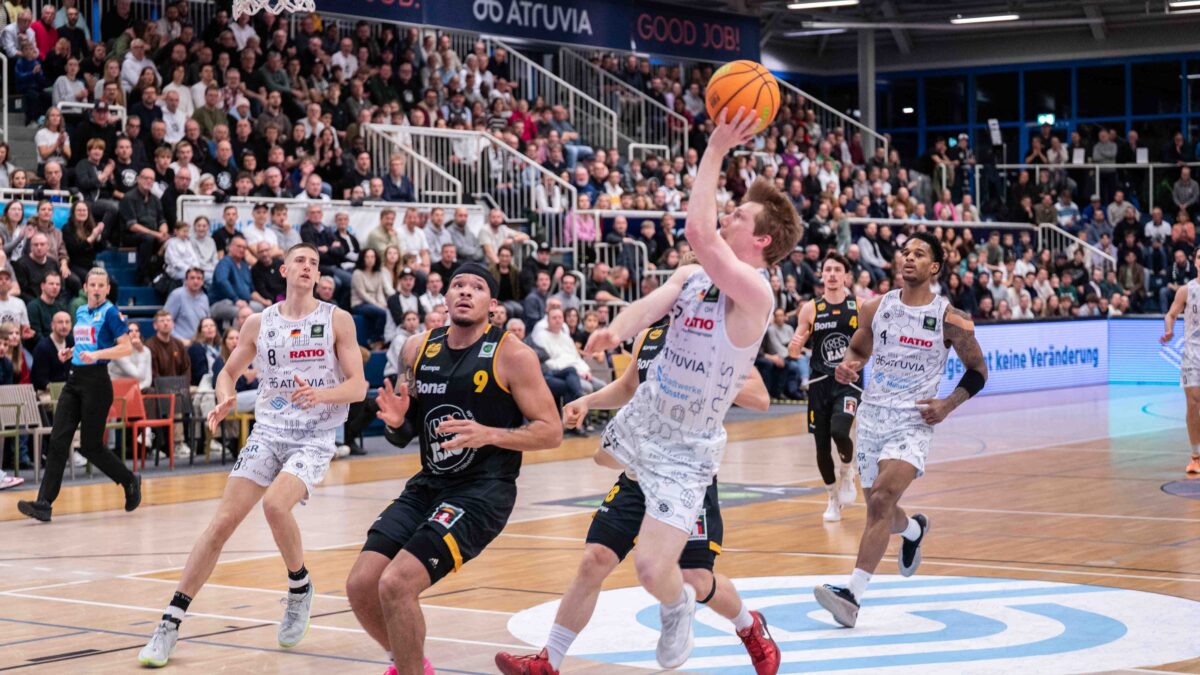 Im zweiten Viertel brachten die Uni Baskets viel Energie auf das Parkett – garniert mit einem Cosmo Grühn (Topscorer mit 23 Punkten) mit enormer Firepower. 11 frenetisch gefeierte Münsteraner Zähler nacheinander lieferte der Kapitän zum 27:27-Gleichstand (13.). Die Partie auf Augenhöhe wog weiter hin und her, ehe sie noch vor dem Seitenwechsel Richtung der Uni Baskets zu kippen schien. Sie bewegten in dieser Phase den Ball – nicht nur zum Masnic-Dreier – sehr gut (38:34, 17.). Münster wirkte entschlossener, war oft nahe dran am Steal und schwächte sich dann selbst ohne Not. Julian Larry bekam ein gänzlich unnötiges unsportliches Foul, sein zweites. Mit dem ersten war das Publikum überhaupt nicht einverstanden, wurde der Aufbauspieler zuvor selbst mehrfach attackiert. Statt der möglichen Pausenführung ging es mit 40:45 in einer intensiven und attraktiven Partie in die Katakomben.