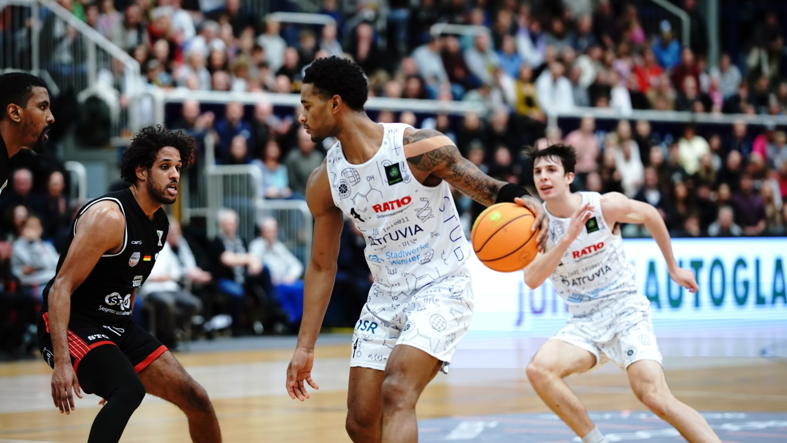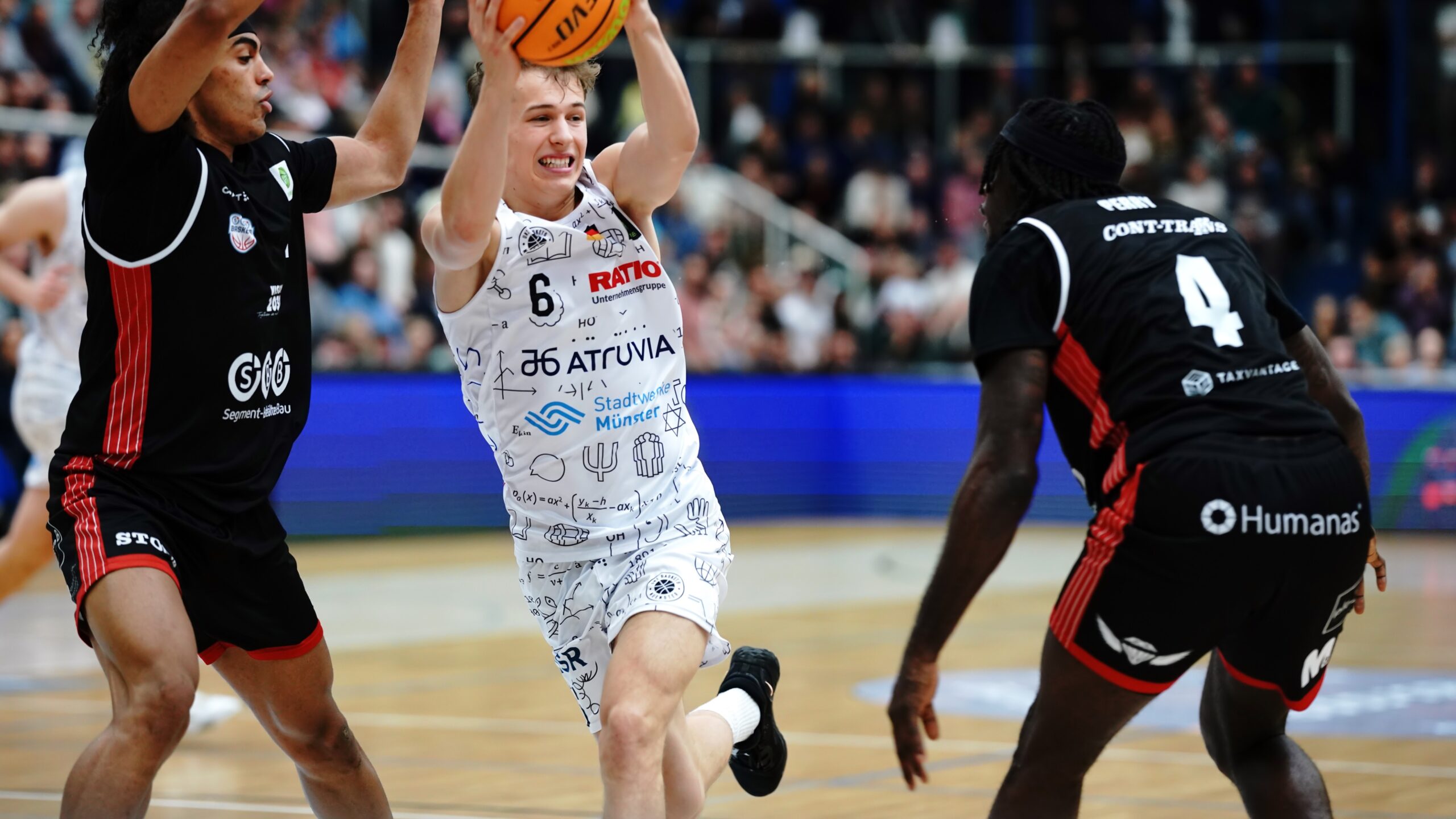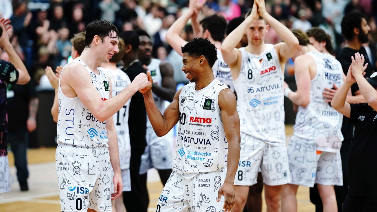 21. Dezember 2025(ts) Das Heimfinale 2025 am Sonntagabend war ein „Quasi-Finale“. Die Uni Baskets Münster mussten gegen den direkten Konkurrenten SBB Baskets unbedingt gewinnen, um im Abstiegskampf der BARMER 2. Bundesliga ProA nicht den Anschluss zu verlieren. Und taten dies in leidenschaftlichem Zusammenspiel mit ihren 2.375 enthusiastischen Fans. 77:67 (33:41) hieß es nach 40 nervenaufreibenden und lange hochspannenden Minuten.