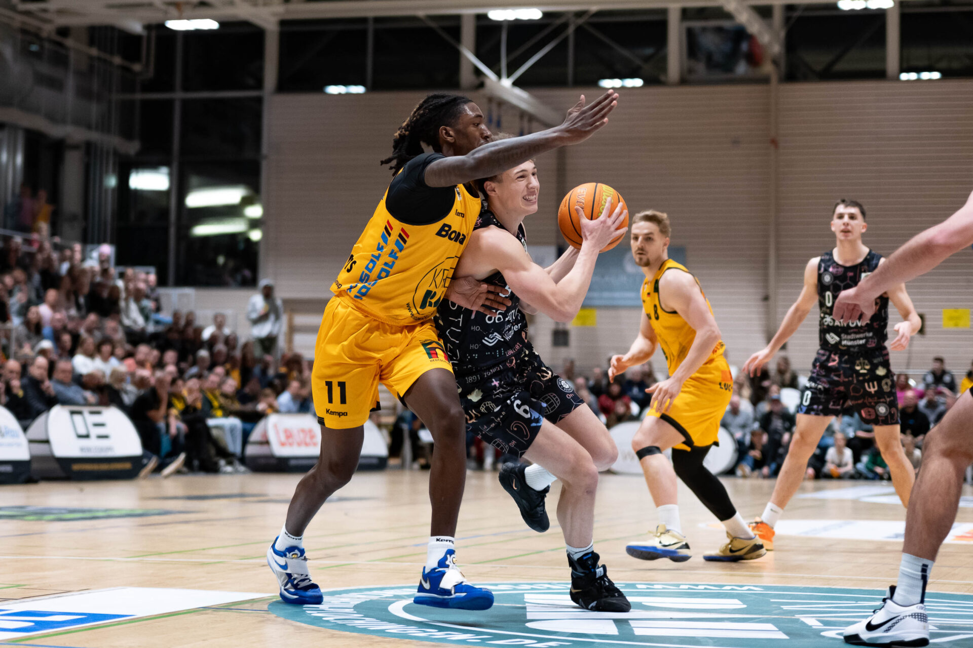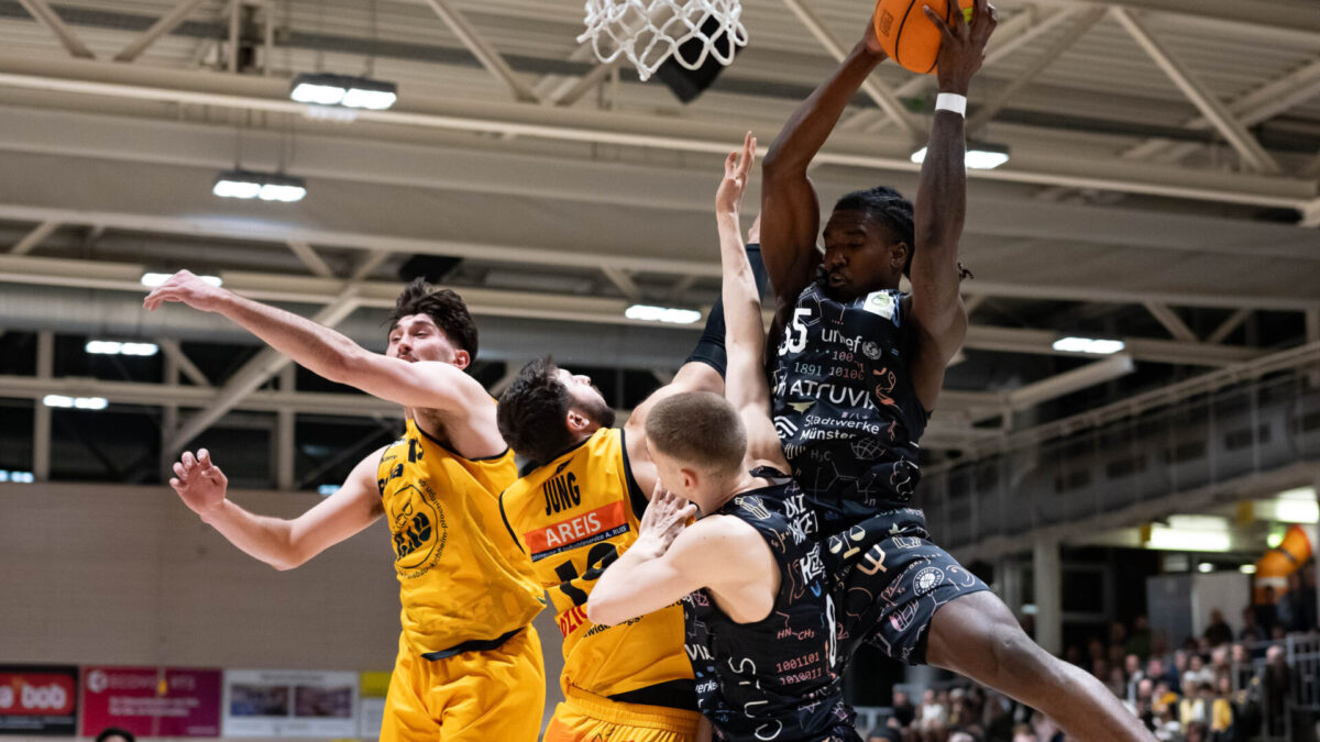 Aus der Halbzeitpause kamen die Gäste noch energischer und schlugen aus ihren Ballgewinnen mit einem Dreierhagel Kapital. Vor dem Seitenwechsel trafen sie nur einen ihrer sechs Dreiversuche, nach Wiederbeginn derer fünf von sechs in Folge. Vier verschiedene Distanzwerfer brachten ihre Mannschaft auf drei Zähler heran (50:47, 26.). Der gastgebende Seriensieger wankte, aber nur kurz, profitierte von Ballverlusten Münsters (15 nach Viertel drei) und schlug vor allem über seinen Topscorer des Abends, Tylan Pope (24 Punkte), bis zur letzten Viertelpause zurück (63:51).