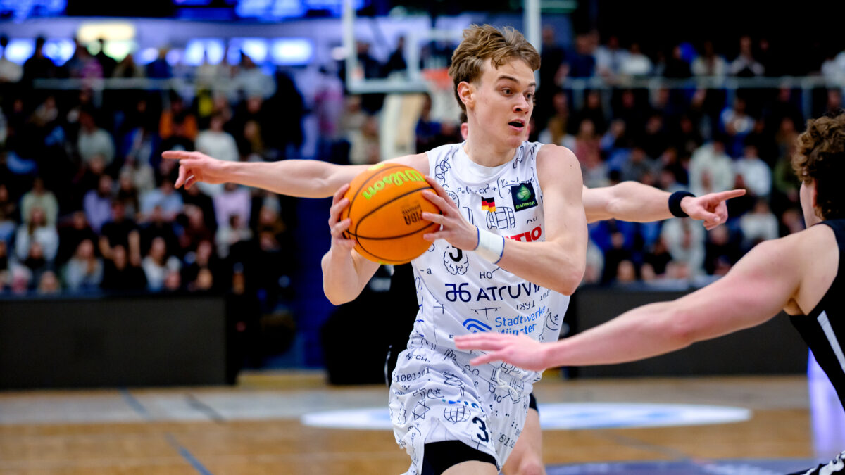 Paul Viefhues hat ein rasantes Jahr 2025 bei den Uni Baskets Münster hinter sich. Das Eigengewächs des UBC Münster hat seine Spielzeit mehr als verdoppelt und seine Punkteausbeute inzwischen verdreifacht. In besonderer Erinnerung ist den Baskets-Fans Paul Viefhues’ Galaauftritt im letzten Oktober gegen Bochum geblieben. Der U20-Nationalspieler erzielte beim Derbysieg 24 Zähler mit einer Quote von 64 Prozent aus dem Feld.