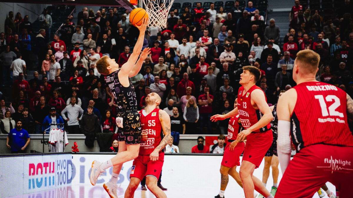 31. Januar 2026(ts) Was für eine große und reife Leistung in der zweiten Halbzeit: Die Uni Baskets Münster haben sensationell 77:74 (31:40) nach einem Buzzer-Dreier von Nick McMullen bei Aufstiegsanwärter GIESSEN 46ers gewonnen. Für die Münsteraner war es der so lange ersehnte fünfte Saisonsieg. Dabei hatte die Mannschaft von Götz Rohdewald vor 2.312 Zuschauern mit dem Ausfall von Neuzugang Deshon Tayloer erneut eine personelle Hiobsbotschaft wegzustecken. Umso bemerkenswerter war der famose Auftritt der kampf- und spielstarken Gäste, bei denen die beiden Youngster Thore Dilschmann und Paul Viefhues (je 14 Punkte) eindrucksvoll aufspielten.