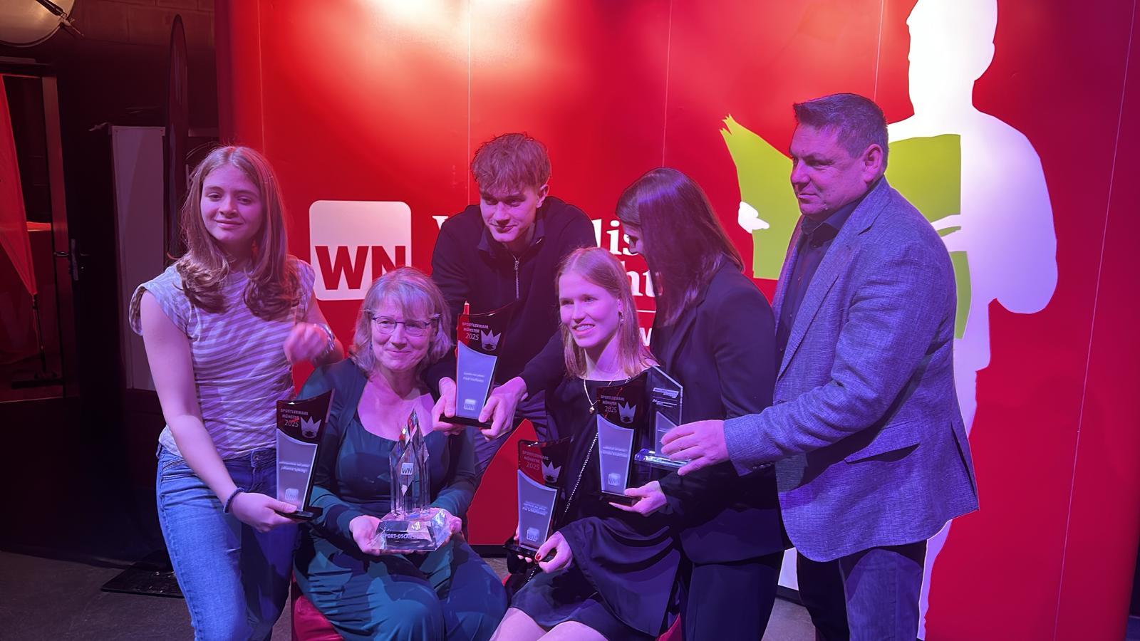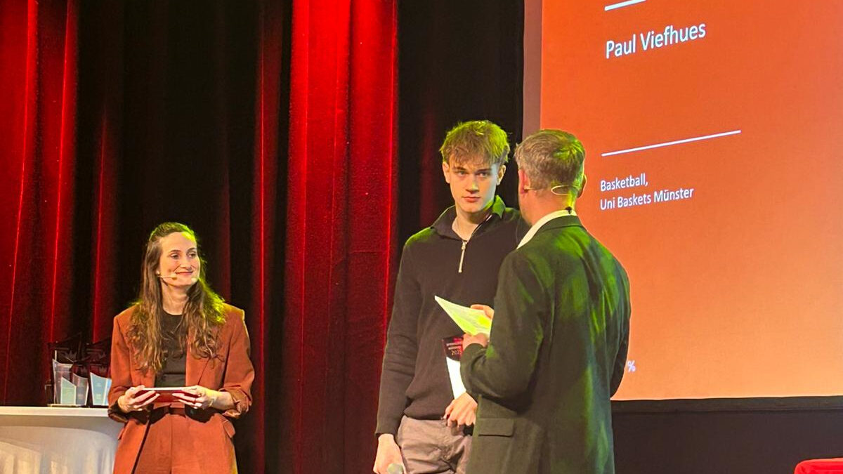 8. März 2026(ts) Paus Viefhues ist Münsters Sportler des Jahres 2025. Die Auszeichnung erhielt der 21-Jährige am heutigen Montag im Jovel-Club bei der gemeinsamen Veranstaltung von den Westfälischen Nachrichten und ANTENNE MÜNSTER. Der Shooting Guard der Uni Baskets setzte sich bei der Publikumswahl vor Langstreckenläufer Manuel Kruse und dem Springreiter Gerrit Nieberg durch. Viefhues kam bei der Wahl auf 28,2 Prozent der Stimmen. Überreicht wurde ihm die Trophäe von AM-Moderatorin Lena Zils und WN-Redakteur Thomas Rellmann.